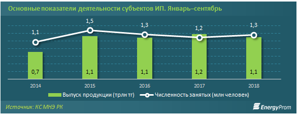 В целом по итогам третьего квартала 2018 года численность занятых в действующих ИП составила 1,3 миллиона человек - на 6,9 процента больше, чем годом ранее. Выпуск продукции за январь-сентябрь 2018-го составил 1,1 триллиона тенге, что на 6,6 процента меньше, чем за аналогичный период предыдущего года.