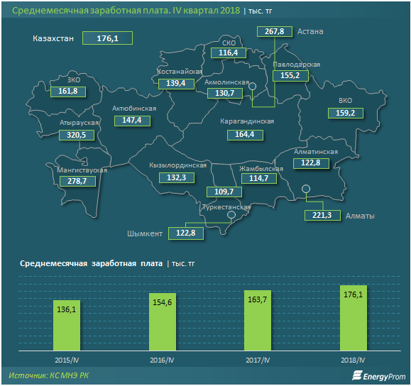 Наибольшая среднемесячная заработная плата традиционно зафиксирована в Атырауской области - 320,5 тысячи тенге (+11,2 процента за год), Мангистауской области - 278,7 тысячи тенге (+3,4 процента за год) и в столице - 267,8 тысячи тенге (+1,7 процента за год).