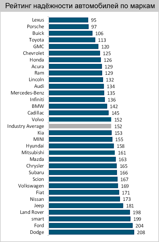 Список составлен на основе опроса среди владельцев автомобилей 2013 года выпуска. Водителей просили назвать основные проблемы, которые возникали с их транспортными средствами на протяжении последних 12 месяцев. Степень надежности определялась количеством неисправностей на 100 автомобилей марки.