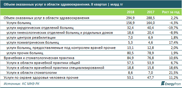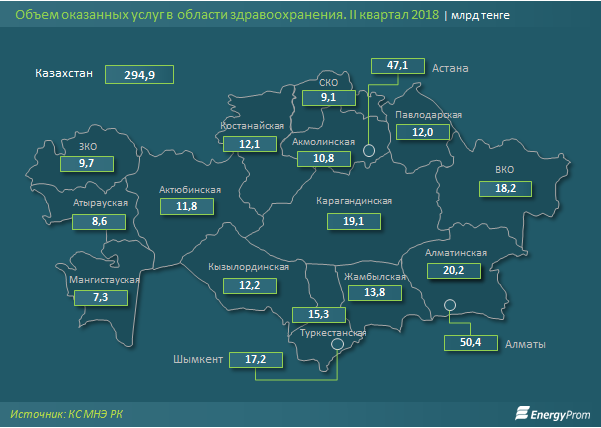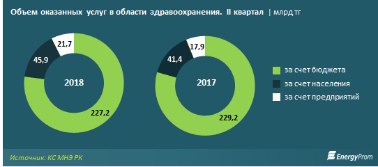 Объем услуг, оказанных в области здравоохранения за второй квартал текущего года, составил 294,9 миллиарда тенге - всего на 2,2 процента больше, чем годом ранее.