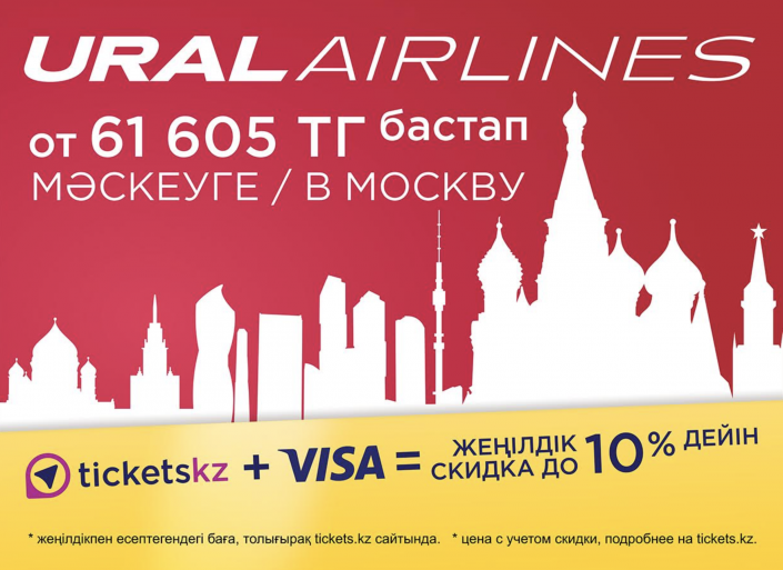 Стоимость полета до Москвы начинается от 61 605 тенге (*Стоимость указана с учетом скидки, зависит от выбранного тарифа и класса). Первый рейс отправится из Международного аэропорта Алматы уже 24 декабря этого года. Билеты в продаже с октября месяца. Онлайн-трэвел-агентство Tickets.kz совместно с международным платежным сервисом VISA предлагают уникальную скидку 10 процентов при приобретении билетов "Уральских авиалиний". Предложение действует с 29 октября по 31 декабря и только по направлениям "Алматы - Москва, Москва - Алматы". Билеты по акции доступны только на сайте tickets.kz при оплате картами VISA.