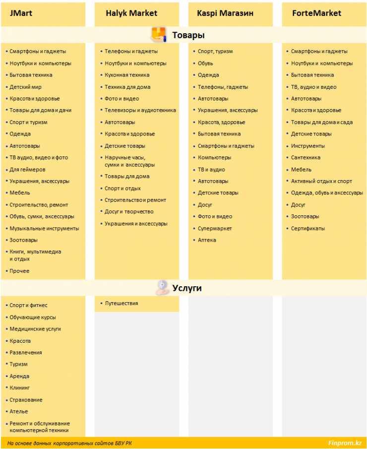 На сегодняшний день четыре крупнейших банка Казахстана наряду с традиционными финансовыми инструментами предлагают услуги собственных маркетплейсов: JMart от Jusan Bank, Halyk Market от Halyk Bank, ForteMarket от ForteBank и Kaspi Магазин от Kaspi Bank.