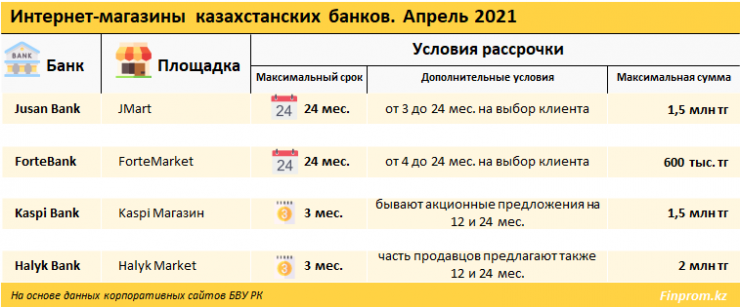 Рассрочку до 24 месяцев также предлагает ForteMarket с пороговой суммой в 600 тысяч тенге. Аналогичный период на других платформах доступен только на акционных условиях, регулярные условия рассрочки там ограничены тремя месяцами.