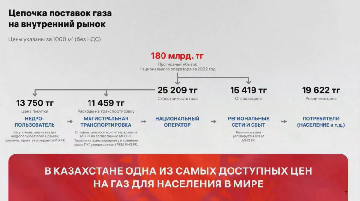 По словам главы нацкомпании, к такой ситуации приводит заведомо убыточное ценообразование. Он отметил, что цены не устраивают недропользователей и компанию, а также создают дефицит товарного газа. Поэтому, как подчеркнул Жаркешов, необходимо реформировать ценообразование с большей нагрузкой на юрлица, промышленные предприятия, которые могут позволить себе другую цену.