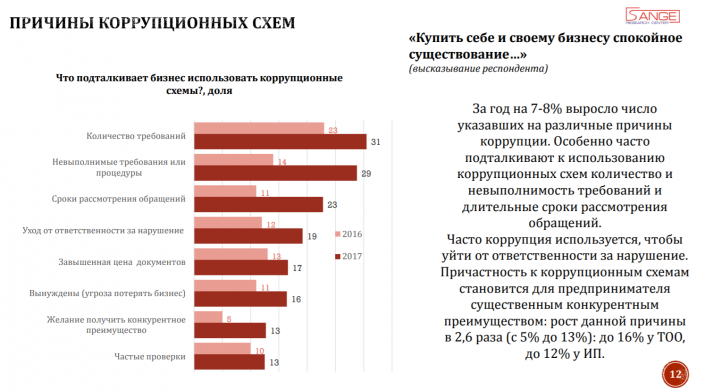 "За год увеличилась доля предпринимателей, сталкивающихся с коррупцией: на 12 процентов тех, кому коррупция мешает, и на 1 процент тех, кому она помогает.  Чем больше размер бизнеса, тем больше ему мешает коррупция. ТОО и крестьянско-фермерские хозяйства сталкиваются с ней на 5-7 процентов чаще, чем ИП и АО. Но все же бизнес встраивается в коррупционные схемы - многим коррупция помогает: крестьянским хозяйствам чаще (14,4 процента), чем другим. На втором месте индивидуальные предприниматели (8,3 процента)", - говорится в результатах исследования.