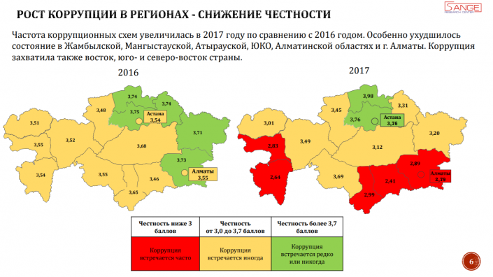 "Можно заметить, что наименее честными и эффективными оказались госорганы Жамбылской, Атырауской областей, Алматы, Алматинской области и ЮКО. Астана и СКО оказались наиболее честными и эффективными. В Мангистауской области самый большой размер взяток. Эта область также превосходит другие по количеству ответивших, что коррупция помогает, - 33 процента", - отметили в НПП.