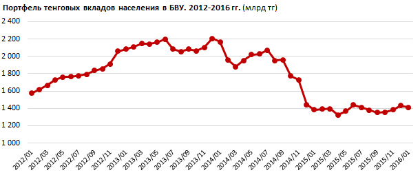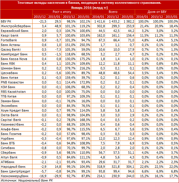 "После стабилизации рынка тенговых депозитов населения в четвертом квартале 2015 года, в январе 2016 тренд сменился падением на 1,5 процента, до 1,411 триллиона тенге. За январь только 14 БВУ из 33, входящих в систему гарантирования вкладов, показали рост депозитов в нацвалюте. Общее сокращение тенговых вкладов составило 21,5 миллиарда тенге",  - отметили аналитики.