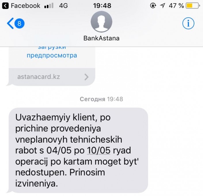 В Банке Астаны клиентов оповестили о том, что с 4 по 10 мая ряд операций по картам может быть недоступен из-за проведения внеплановых технических работ.