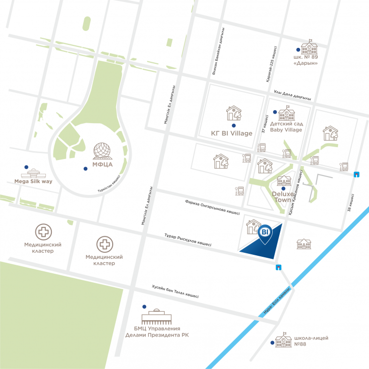 Новый проект расположится в центре левобережья неподалеку от EXPO и будущего здания Нацбанка в квадрате улиц Фаризы Онгарсыновой, Турара Рыскулова, Касыма Кайсенова.