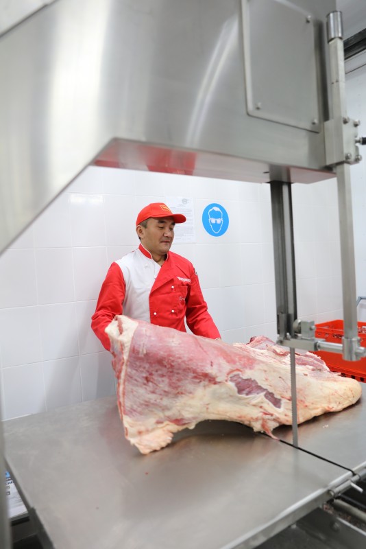 "Пожалуйста", – говорит Мухаметкерим Ернат и проводит в свой цех. Мясники - все крупные мужчины в кольчужных фактурах. Мухаметкерим их бригадир: "Мы как разделываем? Делаем из мяса конфетку! Чтобы человек хотел купить это мясо, оно должно быть красивым. Наши поставщики - проверенные местные фермеры, которые соблюдают все санитарные нормы. Я сам мясо люблю, я же казах! Пятый год в "Магнуме" работаю. Пришел простым мясником, теперь работаю бригадиром мясного цеха. Я горд, что меня назначили на такую ответственную должность".