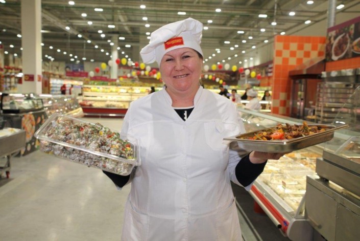 За свежесть блюд в кулинарии отвечает заведующая производством Роза Гилязитдинова. Дальше экскурсию продолжает она - ведет по своим цехам: салатному, горячему, пирожковому, рыбному.
