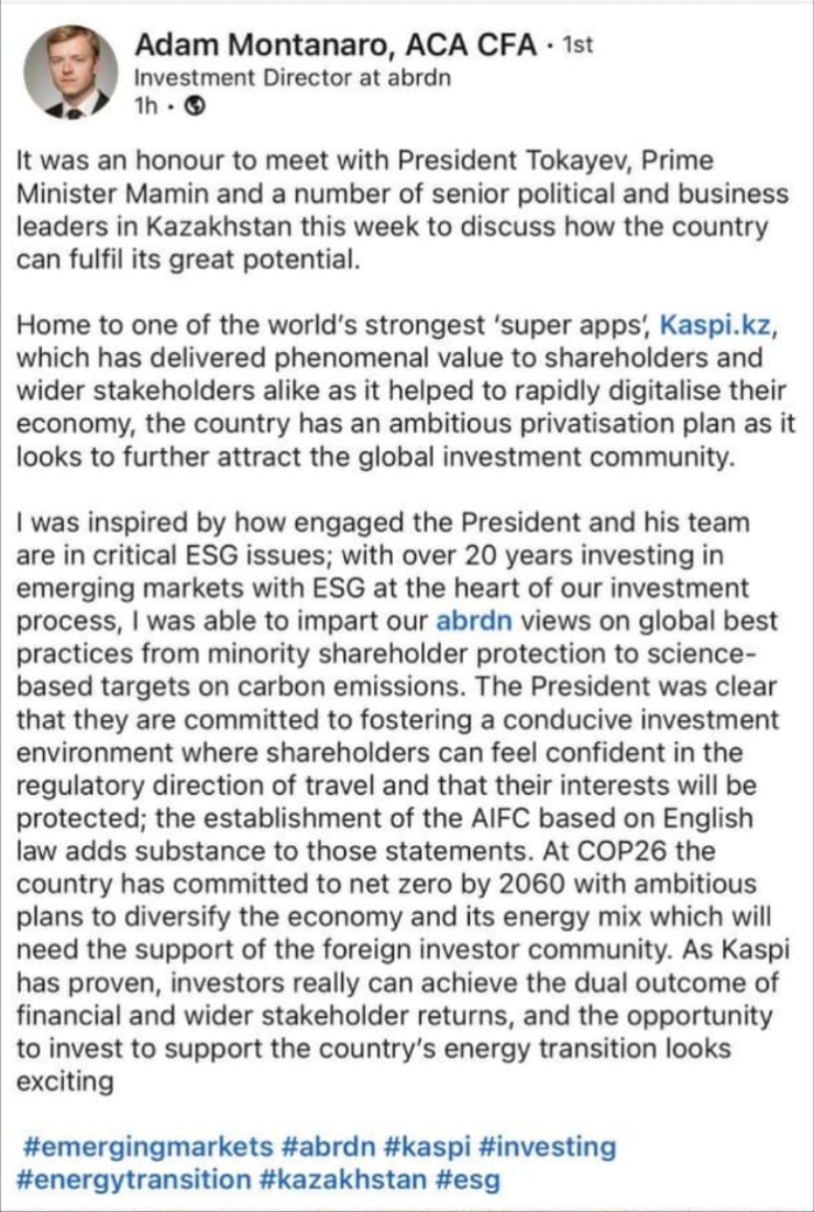 "Для меня было большой честью встретиться с Президентом Токаевым и обсудить огромный потенциал страны, - написал после встречи инвестиционный директор компании Aberdeen Asset Management Адам Монтанаро на своей странице в социальной сети. - Kaзахстан - родина Kaspi.kz, одного из сильнейших в мире суперприложений, которое принесло феноменальную ценность инвесторам и стране, помогая диджитализации экономики".
