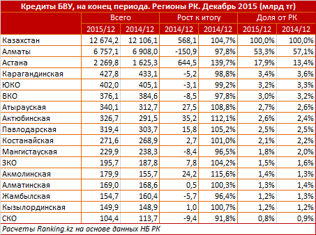 "Помимо непроизводственной сферы, отраслью, где портфель банковских кредитов сократился, является строительство (- 13,3 процента). Однако это, скорее, связано с тем, что застройщики в 2015 году получили значительную государственную поддержку на более выгодных условиях, - пояснили специалисты. -  В региональном разрезе наиболее заметной тенденцией выглядит рокировка между двумя столицами. Так, доля Алматы в общем кредитном портфеле снизилась за год с 57,1 процента до 53,3 процента. В то же время доля Астаны выросла с 13,4 процента до 17,9 процента. В общей сложности доля двух мегаполисов за год увеличилась с 70,5 процента до 71,2 процента".