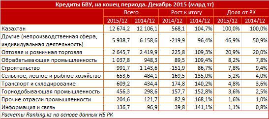 По итогам 2015 года, совокупный кредитный портфель БВУ РК увеличился на 4,7 процента, до 12,67 триллиона тенге. Наряду с этим, по данным аналитиков, отраслевая статистика также показывает опережающий рост кредитования предприятий. Портфель займов в непроизводственной сфере (в том числе кредитов населению, индивидуальным предпринимателям, сервисным компаниям) за год сократился на 5,6 процента, а его доля в общем объеме кредитов БВУ снизилась с 50,9 процента до 46,9 процента, отметили эксперты.