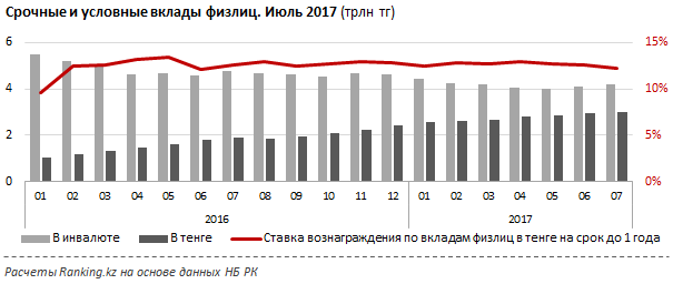 Доля вкладов в национальной валюте у банков, входящих в систему коллективного страхования, за год к концу июля 2017 года выросла с 32 процентов до 44,9 процента и составила 3,6 триллиона тенге. Рост за год на 1,2 триллиона тенге (52,1 процента).