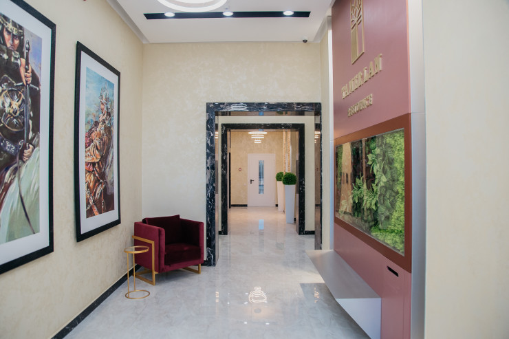 "Для отделки использовались три вида натурального материала: травертин, клинкер и гранит. При монтаже гранита нам удалось добиться идеально ровной и глянцевой поверхности. Исторические мотивы проскальзывают в логотипе жилого комплекса, который напоминает ворота во дворец. Обилие воинов на картинах в холле, художественная композиция в паркинге, иллюстрирующая всадников на конях, отсылают к тематике истории эмира Тамерлана. Концепция жилого комплекса - сплетение прошлого и настоящего".