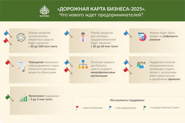Логично, что при таком успехе Дорожная карта получила продолжение. В рамках новой программы, ДКБ-2025, планируется использовать расширенные инструменты: для молодых начинающих предпринимателей размер кредитов увеличится с 20 миллионов тенге до 60 миллионов тенге. Гарантирование останется тем же – до 85 процентов. Расширяется и оборотная часть программы: размер кредитов на пополнение оборотных средств (субсидирование и гарантирование) увеличится с 60 миллионов тенге до 360 миллионов тенге.Кроме того, программа расширит возможности для франшизы.
