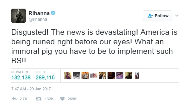 "Отвратительно! Ужасные новости! Америку разрушают прямо на наших глазах! Какой аморальной свиньей нужно быть, чтобы сделать такое", - написала она на своей странице в Twitter. При этом Рианна в конце тирады использовала сокращение BS от английского ругательного слова. Менее чем за сутки пост певицы набрал свыше 130 тысяч ретвитов, более 260 тысяч "лайков" и огромное количество комментариев.