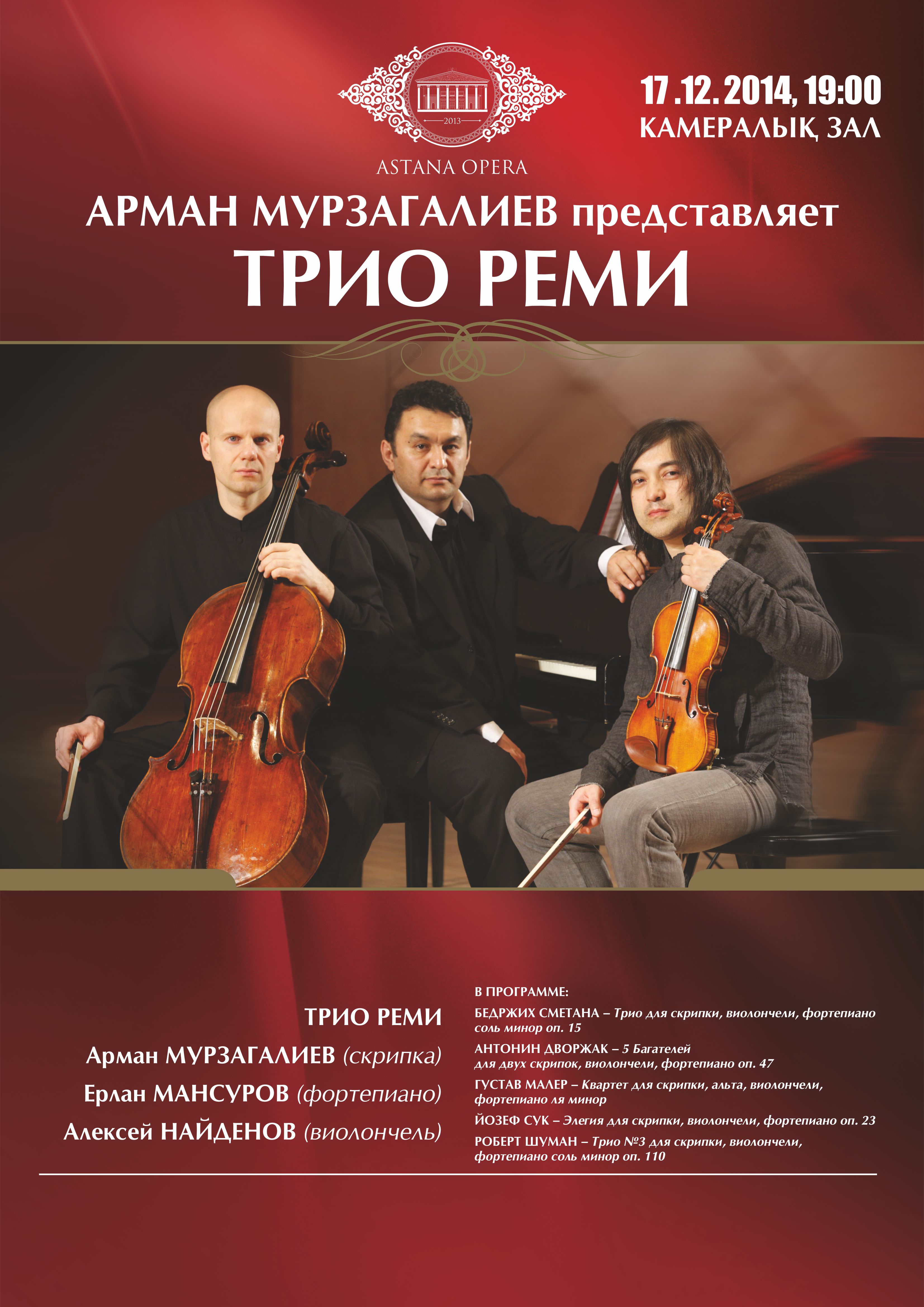 В программу вечера в "Астана Опера" включены сочинения Бедржиха Сметаны, Антонина Дворжака, Густава Малера, Йозефа Сука. Скрипач Арман Мурзагалиев выступил в качестве лидера и музыкального руководителя созданного им трио, объединившего солистов высочайшего класса. Уникальность этого трио заключается в широчайшем спектре исполняемой музыки, охватывающей период в три столетия.