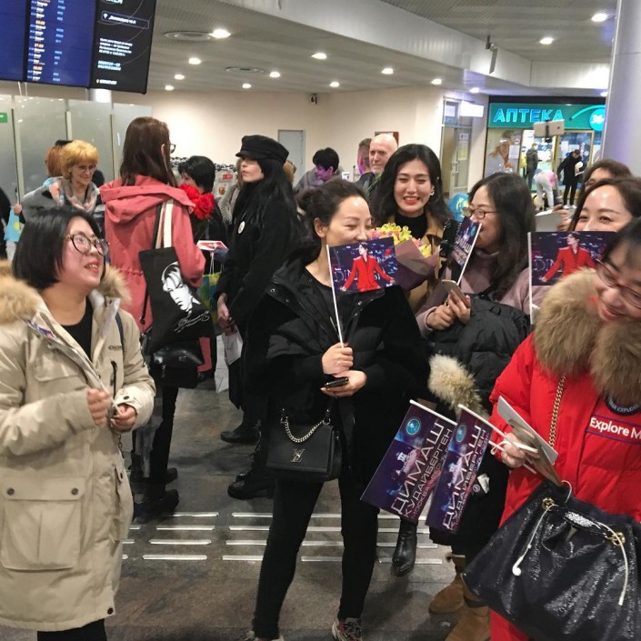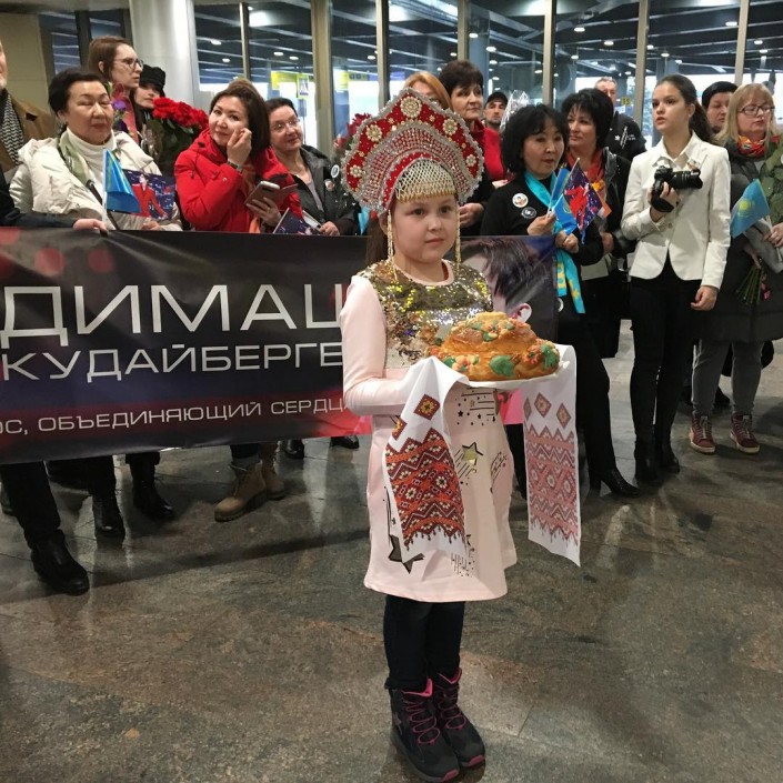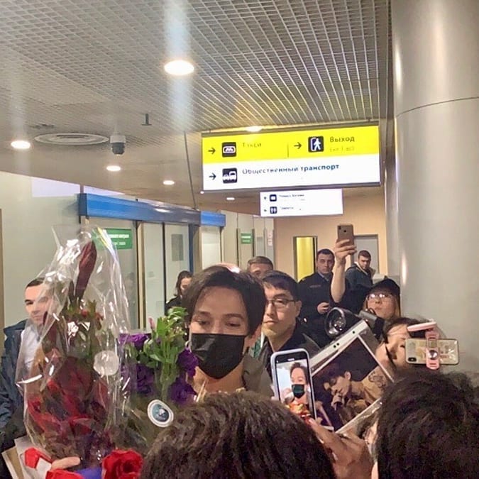 Певец разместил видео, на котором показано, как его встречают фанаты. Десятки людей приехали в аэропорт с цветами, флагами Казахстана, плакатами и угощениями. Поклонники признавались своему кумиру в любви, фотографировались с ним, желали удачи, счастья, здоровья.