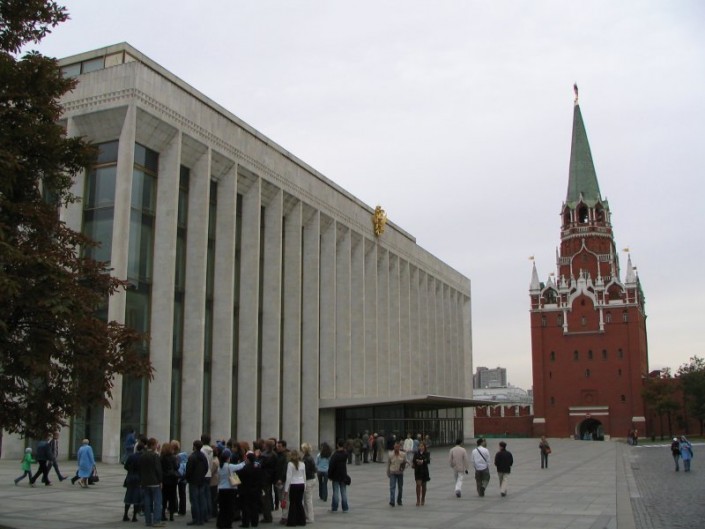 Государственный Кремлевский дворец расположен на территории Московского Кремля. Имеет статус самой престижной театрально-концертной площадки России. На фото изображен фасад здания. © wikipedia