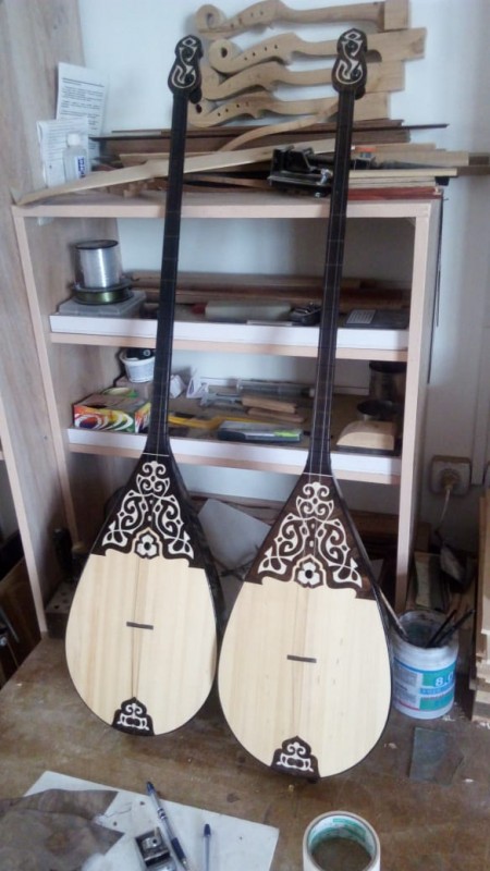 Өрнектеліп, перне-ішектері, құлақ-тиектері қойылған дайын домбыралар. © Жолаушы Тұрдығұлов