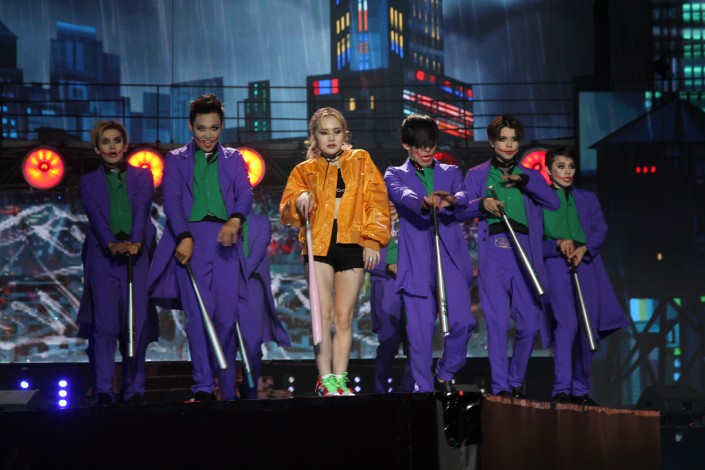 Певица Ziruza решила похулиганить - артистка и ее танцоры вышли на сцену с битами. Видимо, на образы их вдохновили персонажи комиксов DC - танцоры выступили в образе Джокеров.