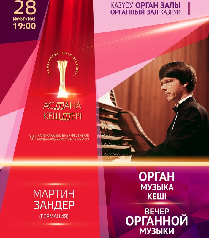 28 мая на вечере органной музыки в органном зале КазНУИ выступит профессор высших школ музыки в Детмольде и Базеле, член жюри многих международных фестивалей Мартин Зандер из Германии.