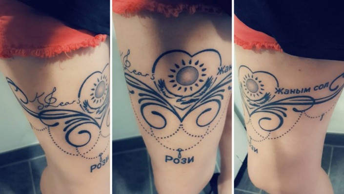 Позже, в мае, Рози ездила в Канны ради встречи с казахстанским исполнителем. Тогда у нее появилась идея для новой татуировки. В июле на бедре француженки уже красовалась другая татуировка. В ее основу легли казахстанский флаг, автограф исполнителя, а также ласковое казахское обращение "Жаным сол". Это выражение она выбрала, потому что ей нравится его значение.