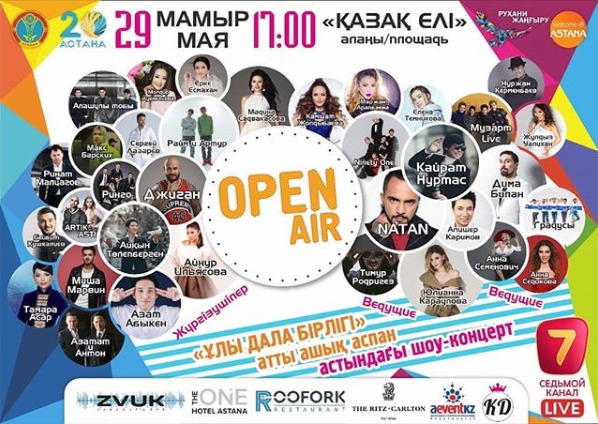 Сегодня в Астане состоится шоу-концерт под открытым небом "Ұлы дала бірлігі". Open Air станет одним из первых мероприятий, которые откроют празднование 20-летия столицы Казахстана. Концерт организован акиматом Астаны в подарок всем гостям и жителям города.