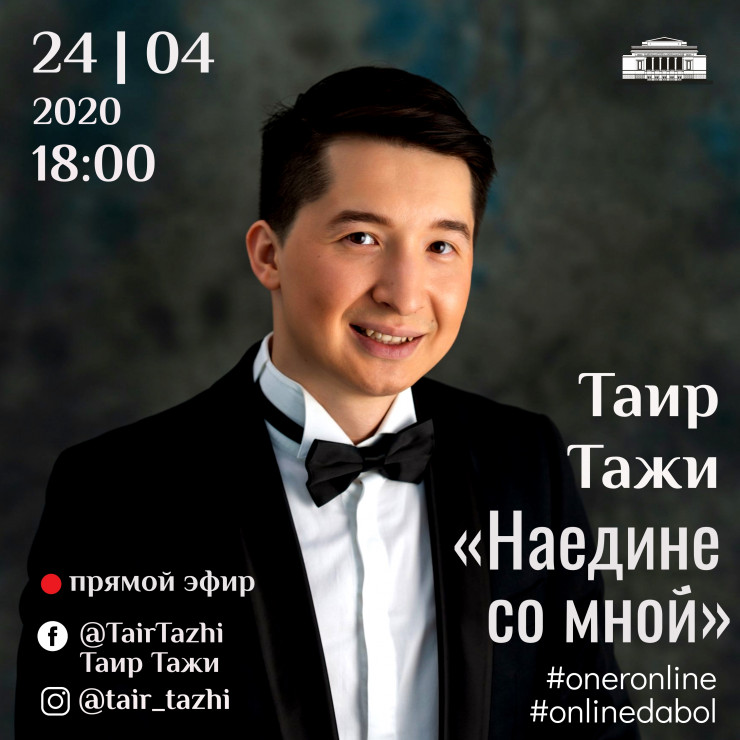 24 апреля в 18.00 ведущий солист оперной труппы театра Таир Тажи (бас) решил внести интригу в online-жизнь. Home Online Concert, на который приглашает исполнитель, получил говорящее название "Наедине со мной”, - на социальных страницах в Facebook Таир Тажи (Tair Tazhi), Instagram. Являясь лауреатом международных конкурсов, проходил обучение и окончил магистратуру в Венской консерватории. Таир Тажи постоянно оттачивает свое мастерство на европейских театральных площадках.