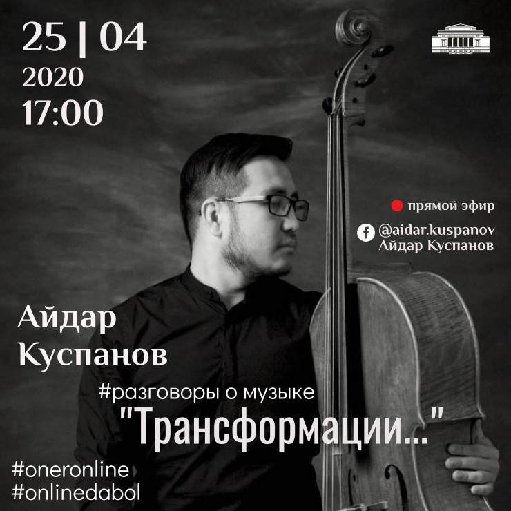 К концертам вокальной музыки теперь добавляется и формат инструментальный. 25 апреля в 17.00 артист оркестра Айдар Куспанов (виолончель) приглашает на разговор о музыке. Встреча названа "Трансформации", и речь пойдет о нескольких музыкальных направлениях: разговор со вселенной виолончельных сюит Иоганна Себастьяна Баха, синтез устного народного песенного творчества казахов и современных западных тенденций, а завершит концертную программу творчество современного итальянского виолончелиста и композитора Giovanni Sollima. Прямой эфир будет доступен на Facebook-странице - Айдар Куспанов (Aidar Kuspanov).