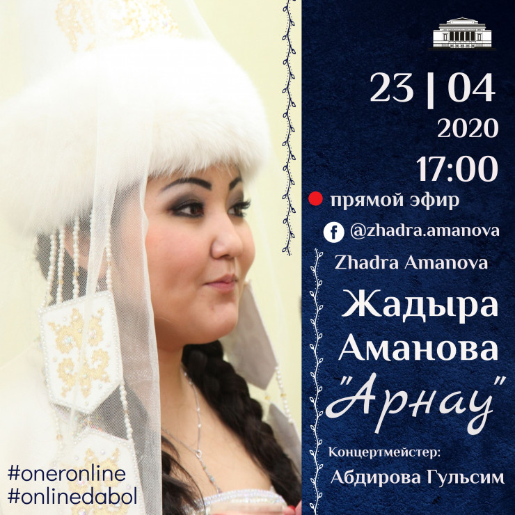 На следующий день, 23 апреля, в 17.00 состоится творческая встреча с солисткой оперной труппы ГАТОБ имени Абая Жадырой Амановой (сопрано). Свою музыкальную программу Жадыра назвала "Арнау", что в переводе означает "посвящение". Артистка театра посвящает ее всем медицинским работникам, которые сейчас борются за спасение жизней и будущее всей страны. В программе зрители услышат великолепные образцы казахской вокальной камерной музыки. Концерт пройдет на Facebook-странице исполнительницы - Zhadra Amanova.