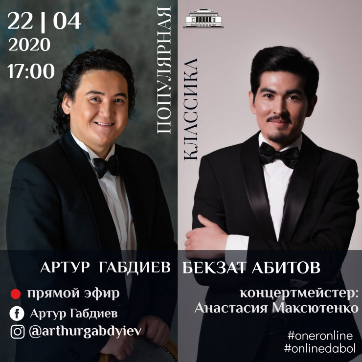 Сегодня, 22 апреля, в 17.00 Home Online Concert представят молодые артисты театра, лауреаты международных конкурсов и премий Артур Габдиев (тенор) и Бекзат Абитов (бас). В программу включены арии из оперы Пуччини, романсы русских композиторов, известные сочинения европейских авторов и казахские песни. Mузыкальная встречa пройдет на странице Facebook - Артур Габдиев и Instagram.