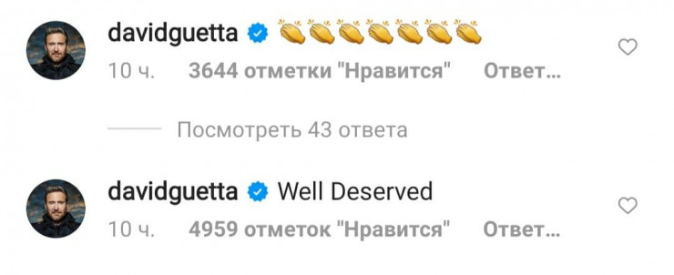 "Вполне заслуженно", - так прокомментировал публикацию французский диджей и продюсер Дэвид Гетта.