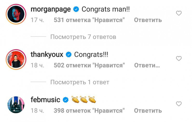 Американский диджей и музыкальный продюсер Стив Аоки поздравил музыканта, прокомментировав его публикацию в Instagram.