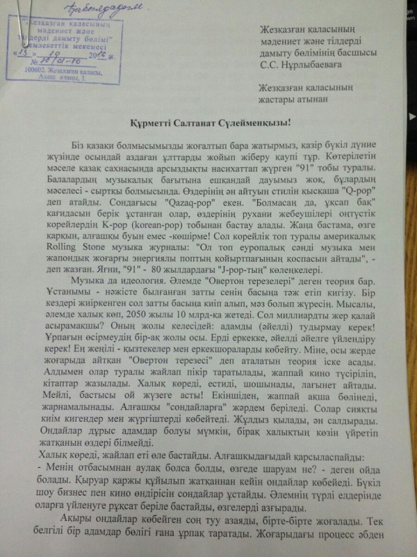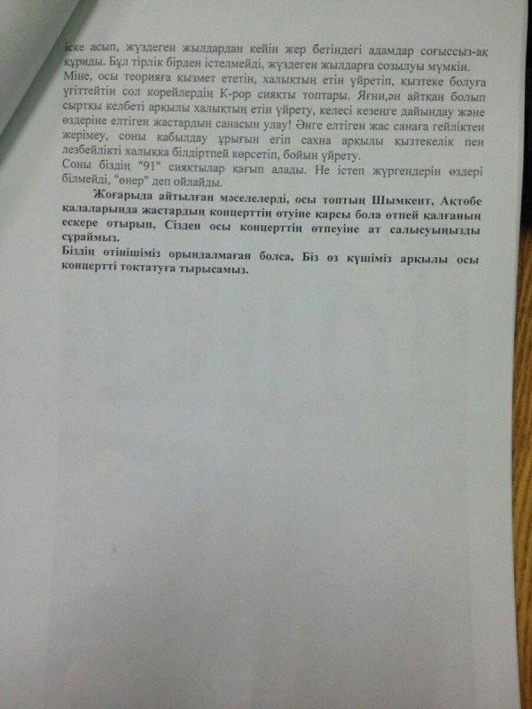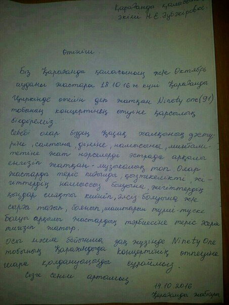 Между тем в Интернете действительно были опубликованы заявления от имени молодежи Октябрьского района. Обращение было сделано в адрес акима города Нурлана Аубакирова. В заявлении активисты писали, что им не нравится вызывающий имидж вокалистов. "Мы, молодежь Караганды и Октябрьского района, против концерта группы Ninety One, который должен состоятся 18 октября в здании цирка. Потому что эта группа показывает дурной пример нашей молодежи. Кроме того, ребята из этой группы идут против традиций, обычаев и менталитета казахского народа. Их крашеные волосы и серьги в ушах портят наших казахстанцев", - говорится в тексте заявления.