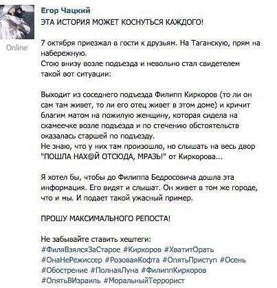 "Все дело в том, что проживая в доме на Земляном валу с 1994 года, Филипп почти 20 лет платил из своего кармана за охрану подъезда и видеонаблюдение. С тех пор, как он переехал, необходимость в этом отпала, и он просто перестал оплачивать эти услуги. Это очень не понравилось Киселевой. Она и ее сын сагитировали других жильцов составить жалобу в ЖЭК, что Киркоров, мол, незаконно занимает подвал в доме, которым, к слову, никогда никто не пользовался. По факту отец Филиппа (82-летний Бедрос Киркоров. - Прим. автора) лишь хранил там плакаты и диски сына. Киселева и жильцы обратились в суд и выиграли его. После этого Бедросу пришлось перевезти вещи из подвала по постановлению суда. Но, к сожалению, суд не смог вернуть в подъезд охрану, к которой привыкли жильцы. Киселева затаила на Филиппа недовольство. 7 октября он действительно приехал в дом забрать кое-какие вещи. Увидев, что его автомобиль подъезжает, она, видимо, специально закрыла ворота. Филипп столкнулся с ней на выходе из подъезда и высказал, что он думает о ней. Посоветовал впредь не трогать его пожилого отца и не портить ему нервы, а также держаться подальше от него. Никаких грубостей, угроз и тем более кощунственных пожеланий смерти из его уст в адрес Киселевой не звучало. Когда люди преследуют свои интересы и лгут, это понятно, но чтобы делать все настолько цинично? Это трудно объяснить", - сообщила пресс-служба певца.