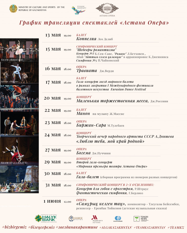 Одной из трансляций, обязательной к просмотру, можно также считать гала-концерт "Мировая премьера театра "Астана Опера", запись концерта покажут 29 мая. Ряд замечательных концертов продолжат симфонические программы, а также шедевр национальной классики – опера "Биржан – Сара" Мукана Тулебаева.
