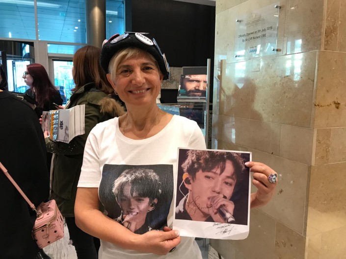 Поклонники Димаша приехали на его концерт из разных стран мира. Одной из поклонниц была турчанка из Японии Хандан. Она тщательно подготовилась к концерту - сделала именные значки и украсила ими берет. Распечатала портрет Димаша на футболке. Признается, что юный певец из Казахстана покорил ее своим трогательным исполнением песни SOS d'un terrien. В Лондоне ей повезло встретиться и поговорить со своим кумиром.