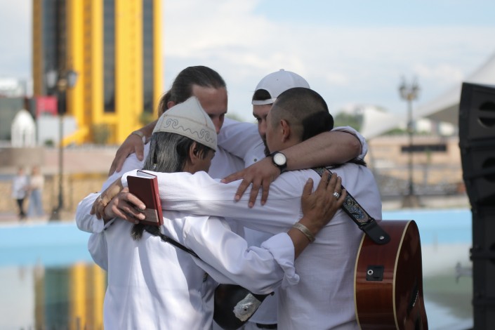 21.45 На площадке появились казахстанский мэтр горлового пения Едиль Хусаинов и уникальная этно-фьюжн-группа Satzhan Project. Музыканты начали свое выступление с завораживающей песни "Күз биі".