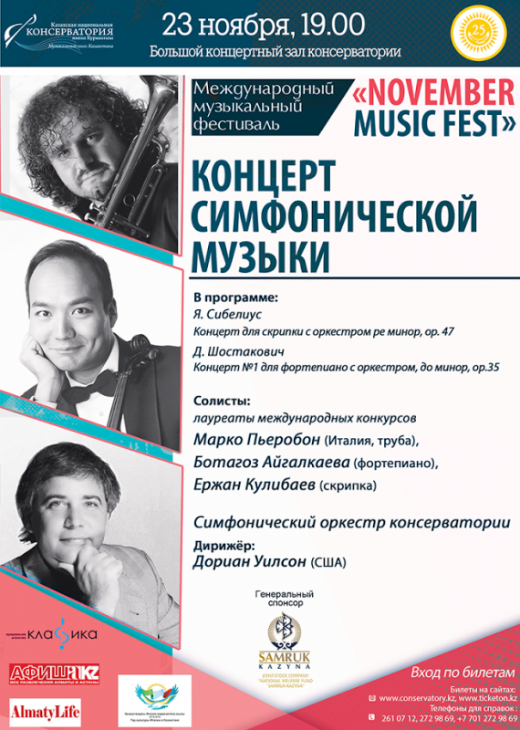 В рамках November Music Fest выступят солисты и коллективы консерватории, ансамбль старинной музыки D’EL’SA Consort, дирижер Дориан Уилсон (США), трубач Марко Пьеробон (Италия), пианистка Ботагоз Айгалкаева, скрипач Ержан Кулибаев, юный пианист Санжарали Копбаев, солисты ГАТОБ имени Абая Зарина Алтынбаева (сопрано), Оксана Давыденко (меццо-сопрано).
