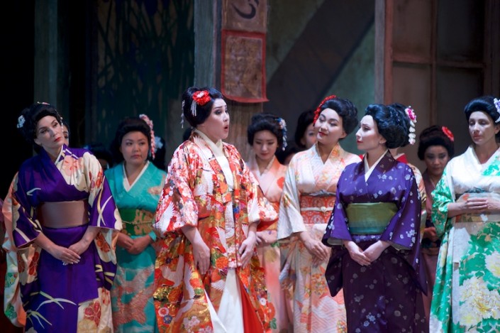 Как всегда, был великолепен хор под руководством заслуженного деятеля Казахстана Ержана Даутова. Сценография для этого спектакля с японским колоритом была создана выдающимся художником современности Эцио Фриджерио. В ней отражен глубокий психологизм истории маленькой гейши. В начале спектакля дом Чио-Чио-сан украшен флагами и окутан нежными цветами, его окружает прекрасная природа, что отображает надежду на счастливое воплощение в жизнь наивной мечты героини на совместную жизнь с Пинкертоном. Дом, пришедший в запустение, увядшие цветы созвучны внутреннему состоянию самой Баттерфяй в конце спектакля: надежды на светлое будущее больше