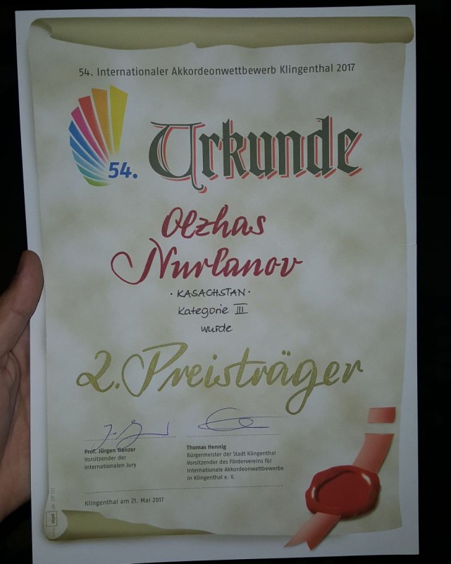 Павлодарец Олжас Нурланов завоевал второе место на 54-м международном конкурсе аккордеонистов и баянистов в Клингентале. Соревнование сравнимо по уровню с Кубком мира. В конкурсе приняли участие 102 музыканта из 28 стран мира. Павлодарский баянист участвовал в третьей возрастной группе в категории конкурсантов до 18 лет, передает корреспондент Tengrinews.kz.