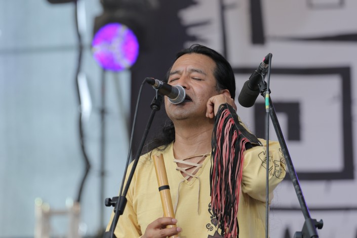 19.30 Музыканты удивили зрителей не только необычным стилем одежды, но и виртуозной игрой флейты, которая прекрасно гармонировала с родовыми барабанами и электрогитарой. В данном проекте участвуют этнические индейцы, которые в своих композициях обыгрывают древнеиндейские мотивы в современной обработке.