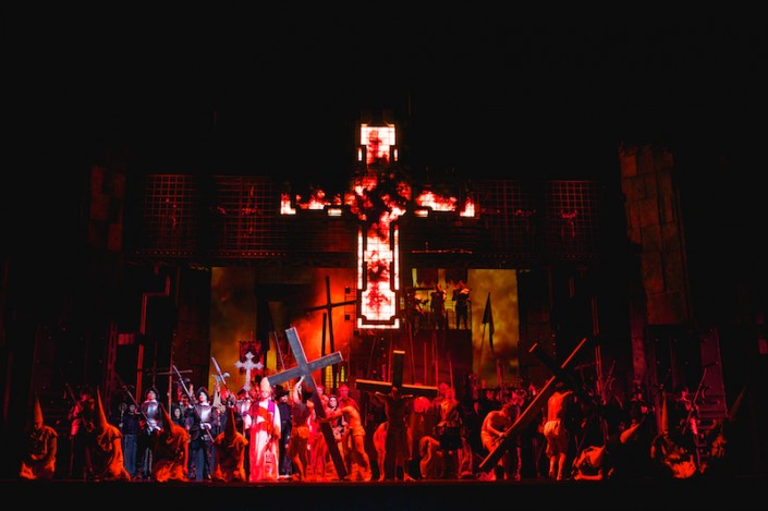 Несмотря на то, что действие показывает исторический период, все же окаменелой классикой назвать спектакль сложно. Современные технические возможности театра позволили сделать его по-современному подвижным, а игра цвета (серебро, черный, красный) напоминала актуальную сегодня dark fantasy. Пылающий пламенем крест, спускающийся из-под театральных сводов, фигура Карла V, застывшая в камне, парящие в воздухе клетки с заключенными в них людьми - все это не могло не поражать воображение. Безусловно, одной из самой ярких сцен стала сцена сожжения еретиков - этот ритуал до мурашек пронизывал своей правдоподобностью, страдания людей были максимально на виду.