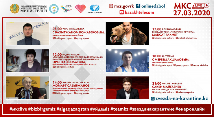 Также Министерство культуры и спорта РК в рамках единой республиканской акции #Bizbirgemiz запустило несколько онлайн-проектов с хештегами #Bizbirgemiz_culture, #Bizbirgemiz_sport, # BirgeЕңсереміз и другие.