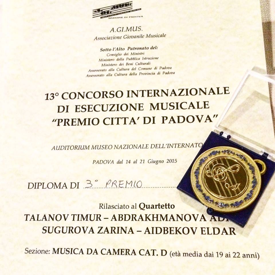 "С квартетом мы играем с февраля, идея создания квартета появилась как раз на международном конкурсе в Италии. В состав были приглашены высокие профи своего дела. Так как коллектив молодой, то это наша первая награда на таком серьезном конкурсе, я считаю, что начало положено. Эта поездка сплотила нас, вдохновила на дальнейшие шаги к новым победам", - поделился участник коллектива Тимур Таланов.