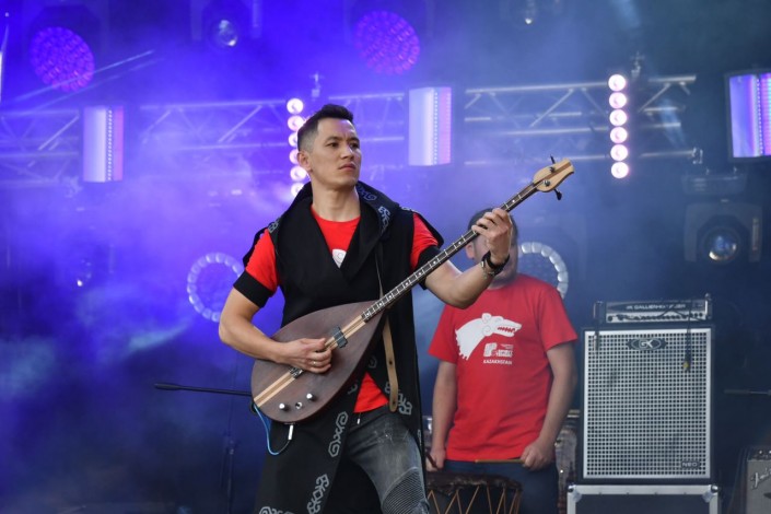 Затем на сцену вышла известная казахстанская этно-рок-группа "Тиграхауд". Музыканты подарили зрителям два варианта исполнения своих композиций: экспериментальная акустика и традиционные этно-рок-вариации.