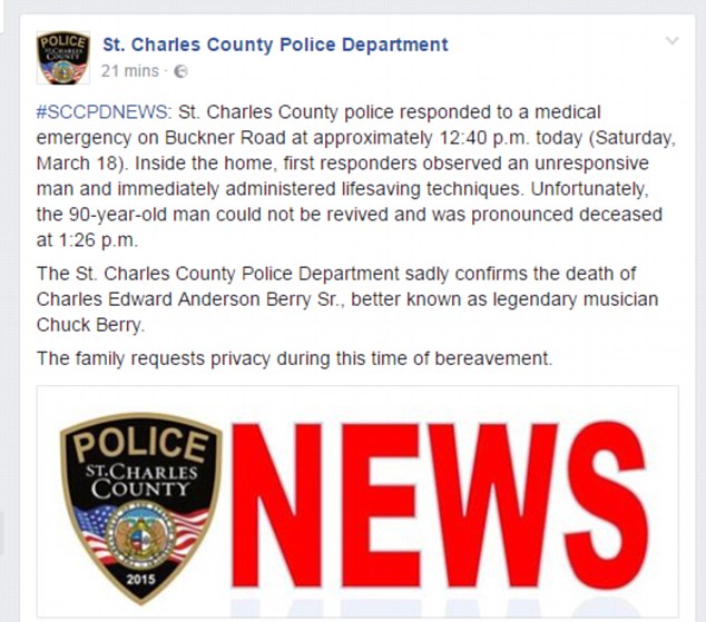 Сообщение полиции о том, что скончавшийся мужчина - музыкант Чак Берри. © Facebook